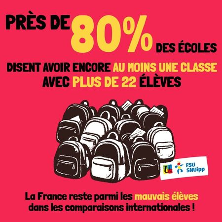 Les classes avec des effectifs surchargés : un phénomène généralisé, mais inégal. Une minorité des écoles déclare ne pas y être confrontée, mais beaucoup déclarent cumuler plusieurs classes au-delà de 22 élèves. La France reste parmi les pays de l’Union Européenne où la moyenne des effectifs par classe est la plus chargée (près de 21 élèves par classe contre 19 dans les vingt-deux pays de l’UE membres de l’OCDE).